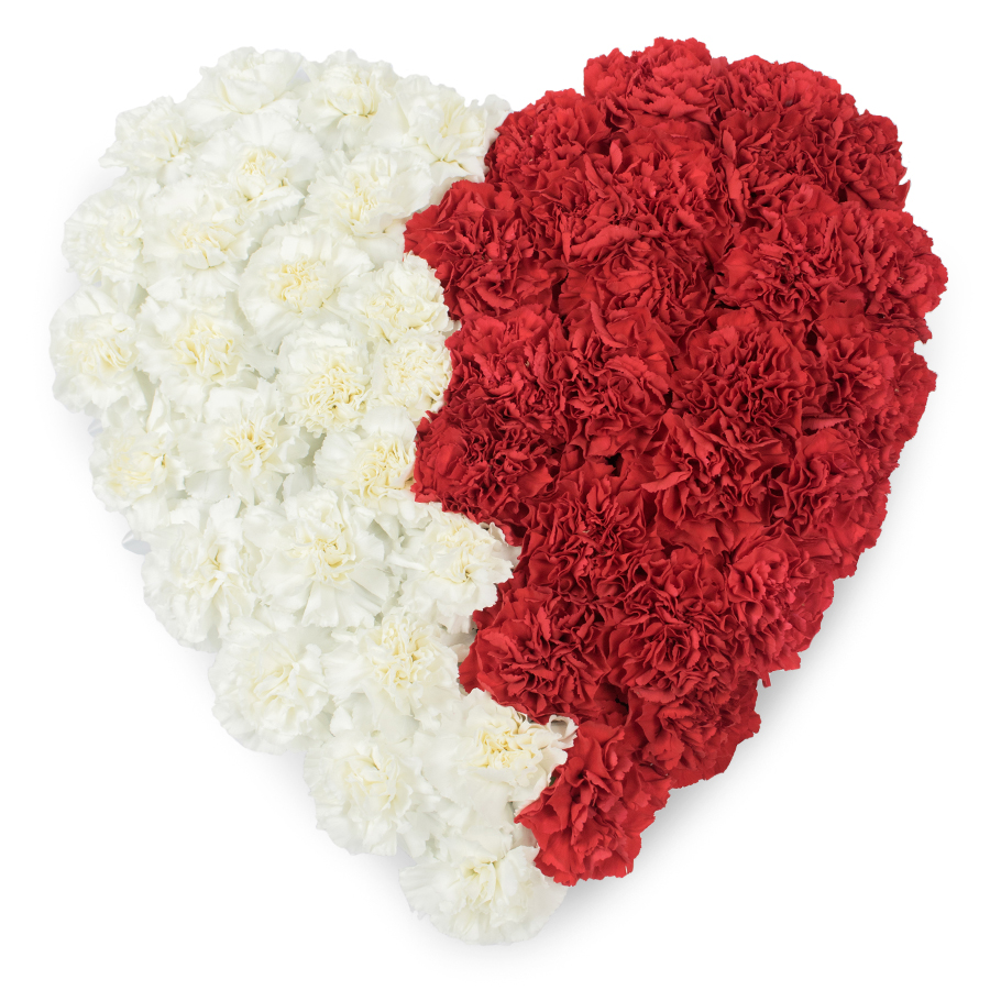 Celebrate the unique beauty of our Sympathy Heart Bouquet, intricately designed by Handy Flowers. This elegant arrangement features a charming combination of white and red carnations, the quintessential flowers for expressing condolences with grace.